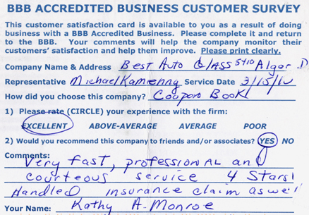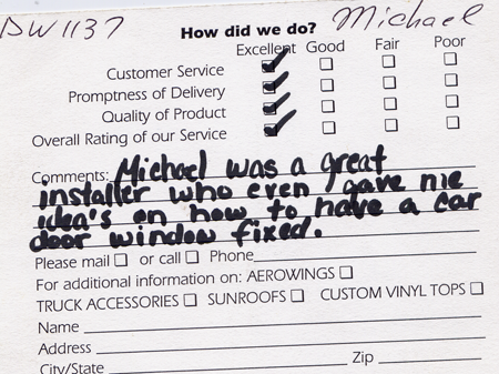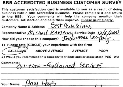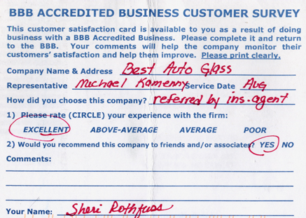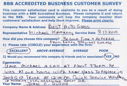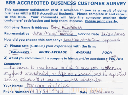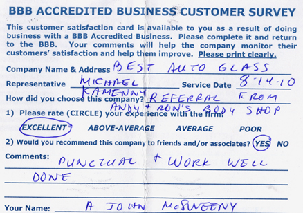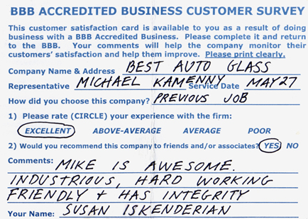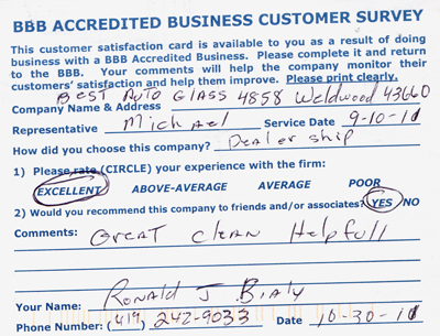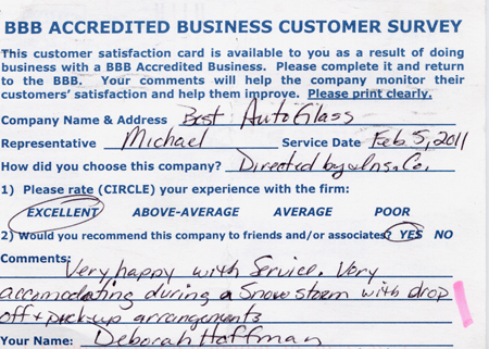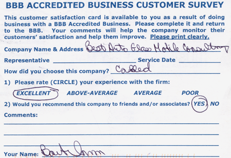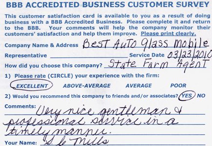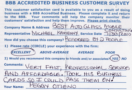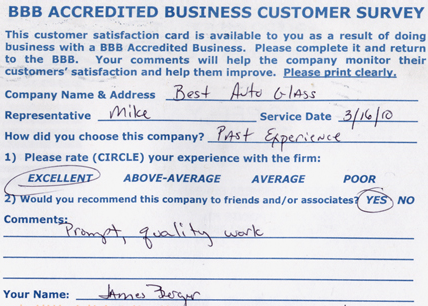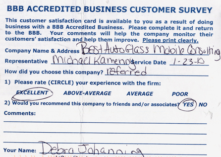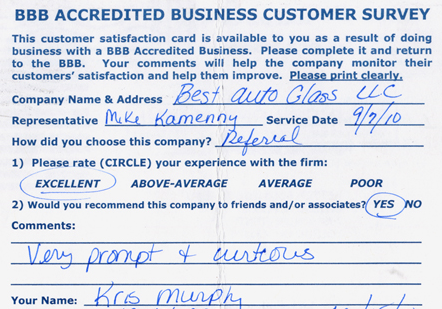 The service was done very professionally and quickly. I also appreciated the courtesy of the Tim Horton's gift card while I waited for the service to be completed. Best Auto Glass served as the calm in an otherwise chaotic day for me. I will certainly refer business your way.