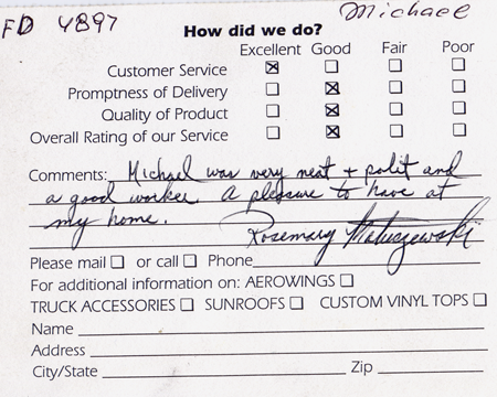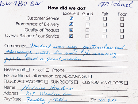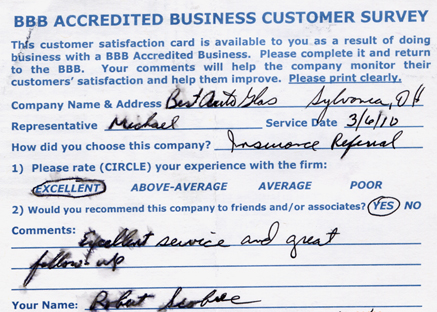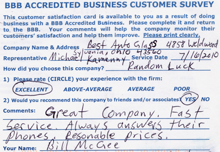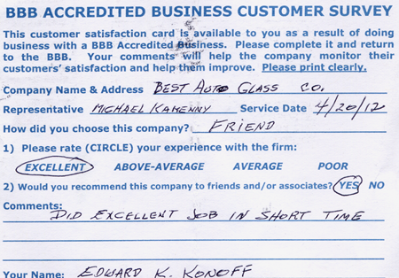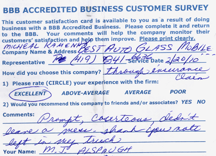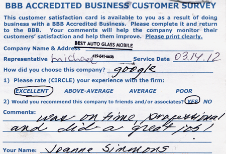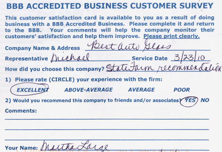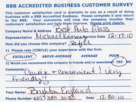 The service was done very professionally and quickly. I also appreciated the courtesy of the Tim Horton's gift card while I waited for the service to be completed. Best Auto Glass served as the calm in an otherwise chaotic day for me. I will certainly refer business your way.